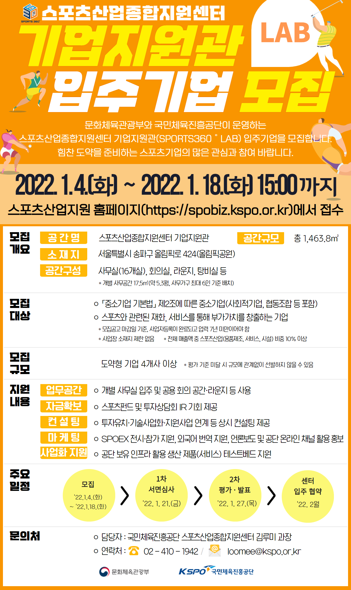 스포츠산업종합지원센터 기업지원관(SPORTS360 LAB) 2기 신규 입주기업 모집 공고입니다. 자세한 내용은 공고문을 참고하시기 바랍니다.