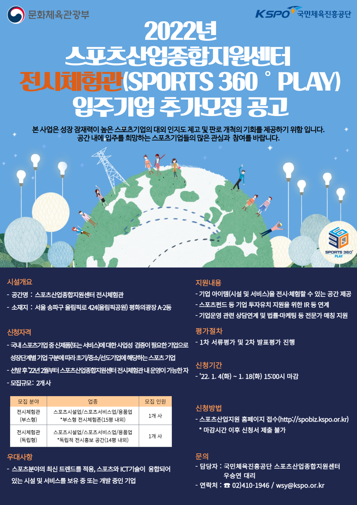 2022년 스포츠산업종합지원센터 전시체험관(SPORTS 360 PLAY) 신규 입주기업 추가 모집공고를 진행합니다. 역량있는 스포츠기업의 많은 관심과 참여 바랍니다. 자세한 내용은 첨부된 공고문에서 확인하시기 바랍니다.