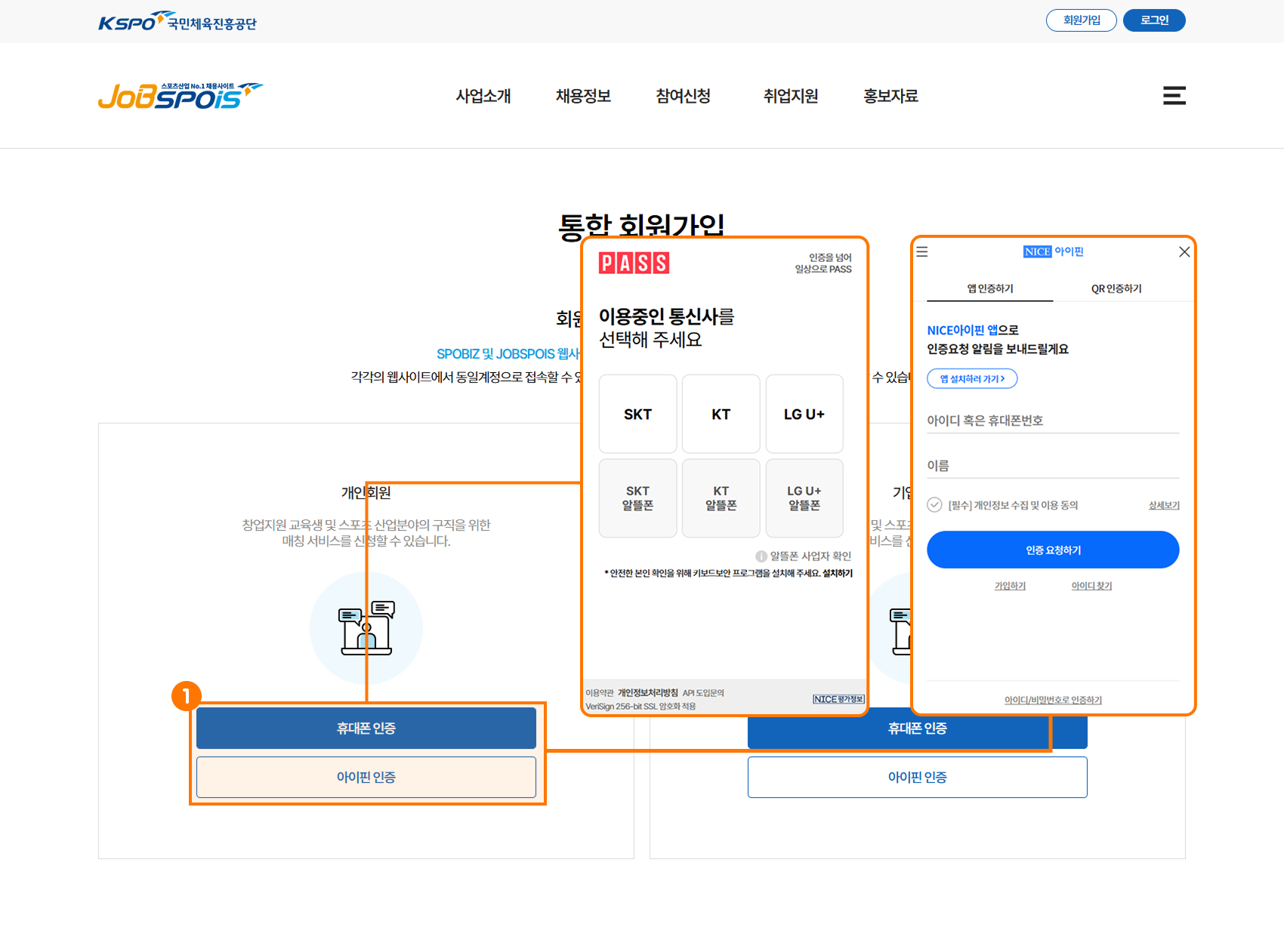 회원가입을 위해 ‘휴대폰 인증’ 또는 ‘아이핀 인증’을 통해 본인인증 절차를 받아야 합니다.