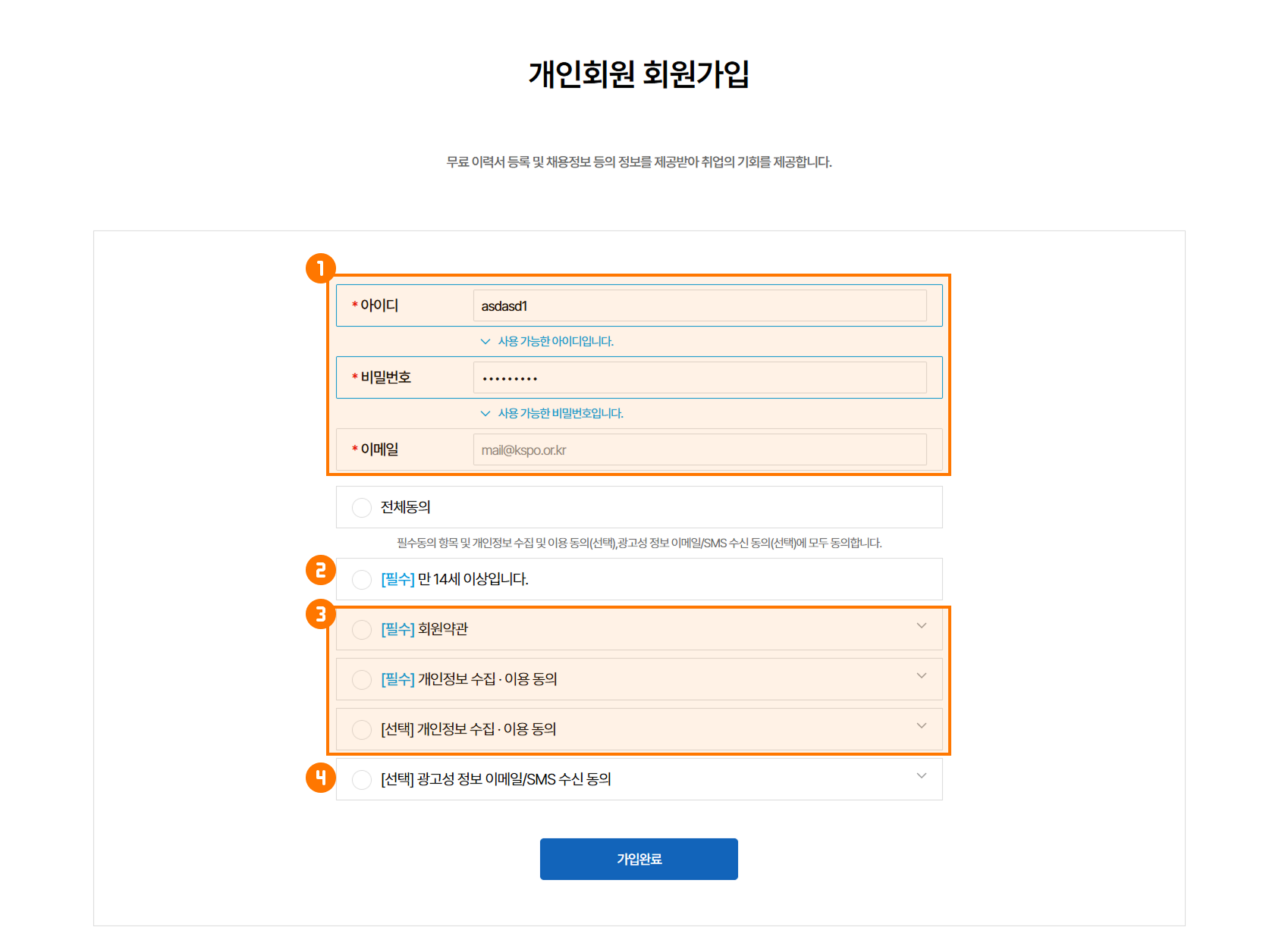 JOBSPOIS에서는 정상적인 회원서비스를 위한 아이디, 비밀번호 등의 필수정보를 입력합니다. - 2