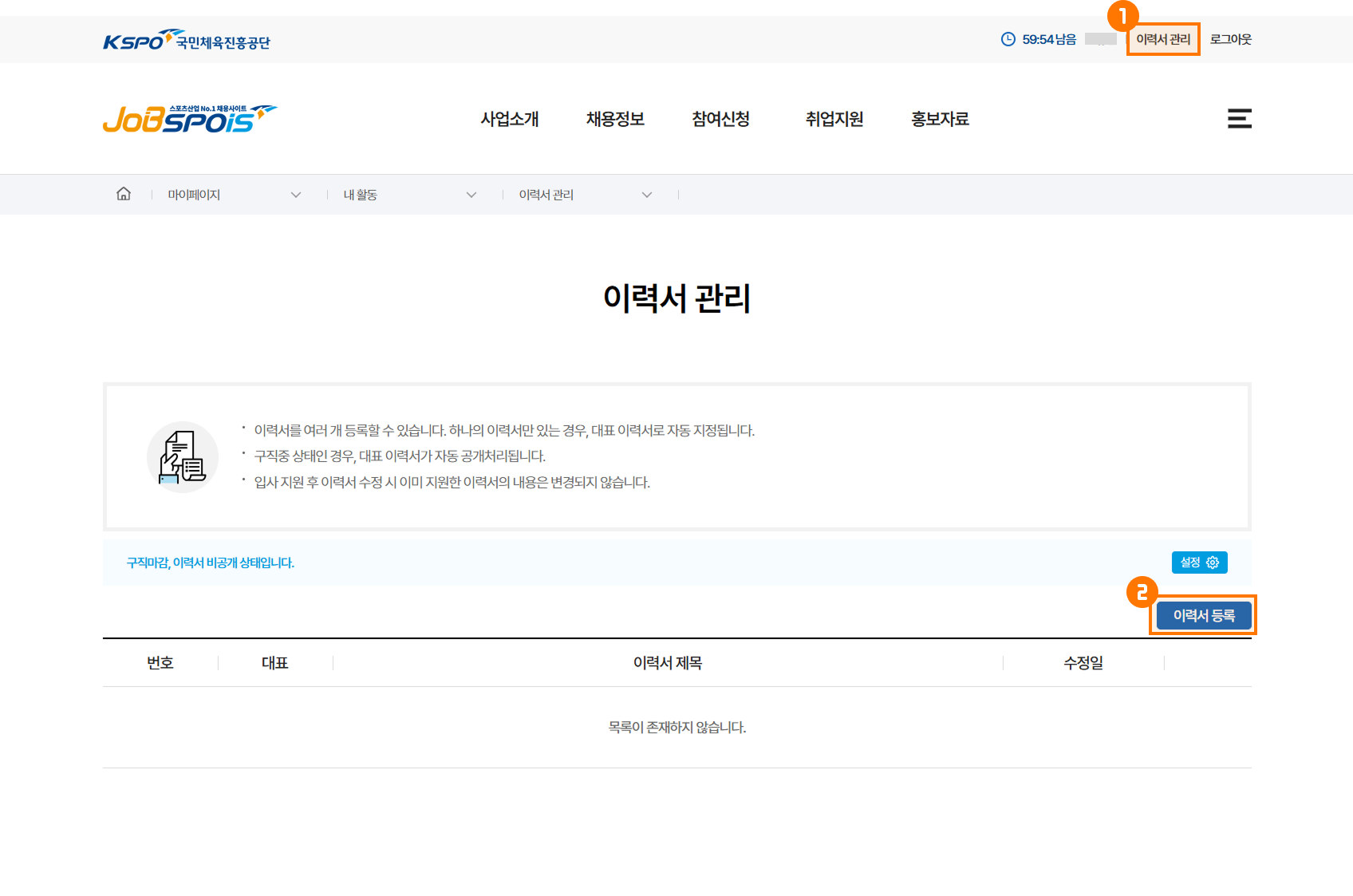 로그인 시 우측 상단의 [이력서 관리] 메뉴로 이동하면 이력서를 등록할 수 있습니다. - 2
