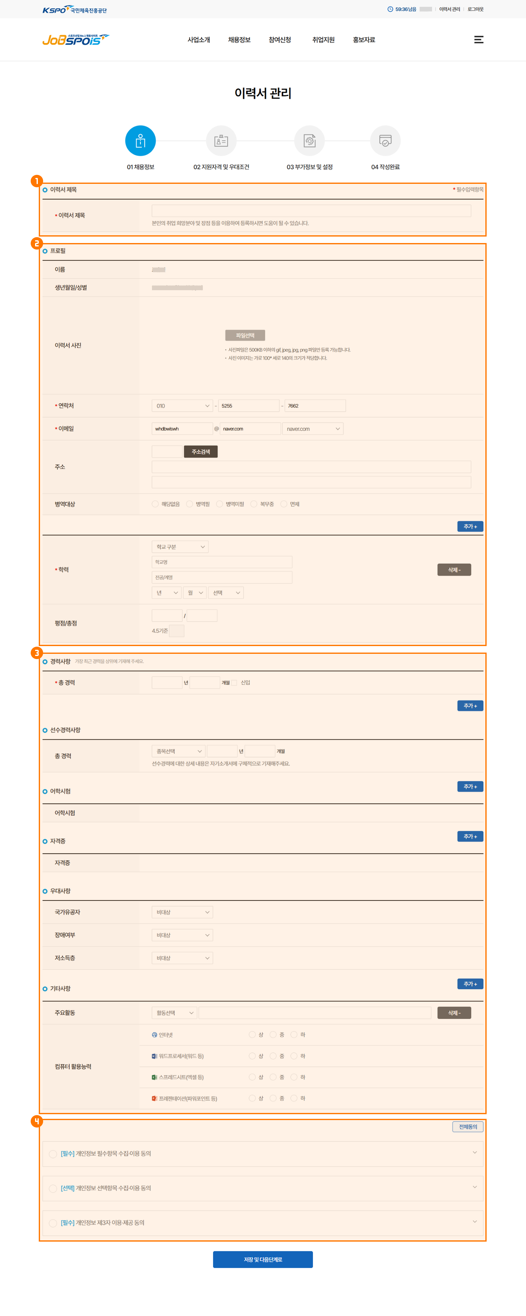 이력서사진, 연락처, 이메일, 주소, 학력사항 등의 일반적인 개인정보를 등록합니다. - 3