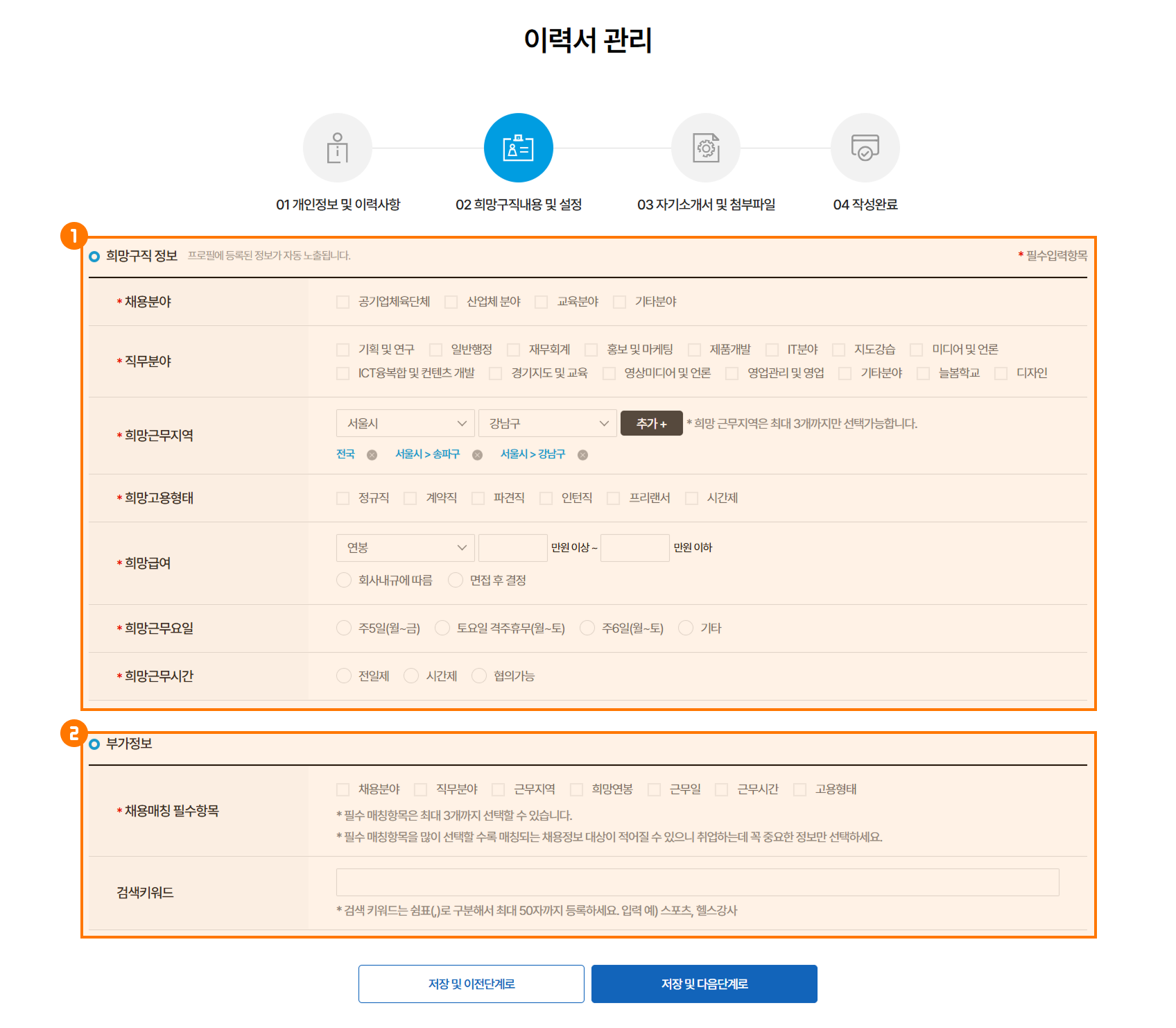 채용분야, 직무분야, 희망지역, 희망고용형태, 희망연봉, 희망근무일, 희망근무시간 등의 희망구직 정보를 등록합니다. - 2