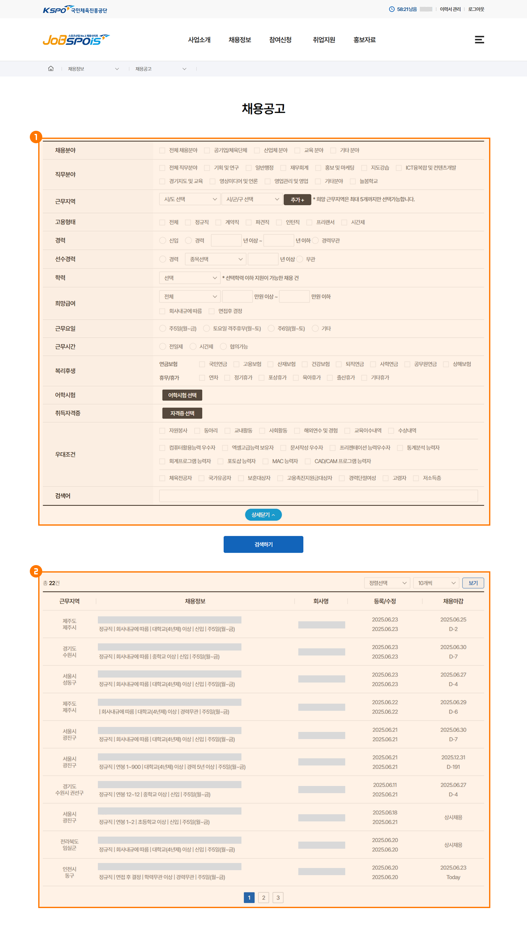 채용분야, 직무분야, 근무지역 등 다양한 조건을 통해 채용정보를 검색할 수 있습니다. - 2