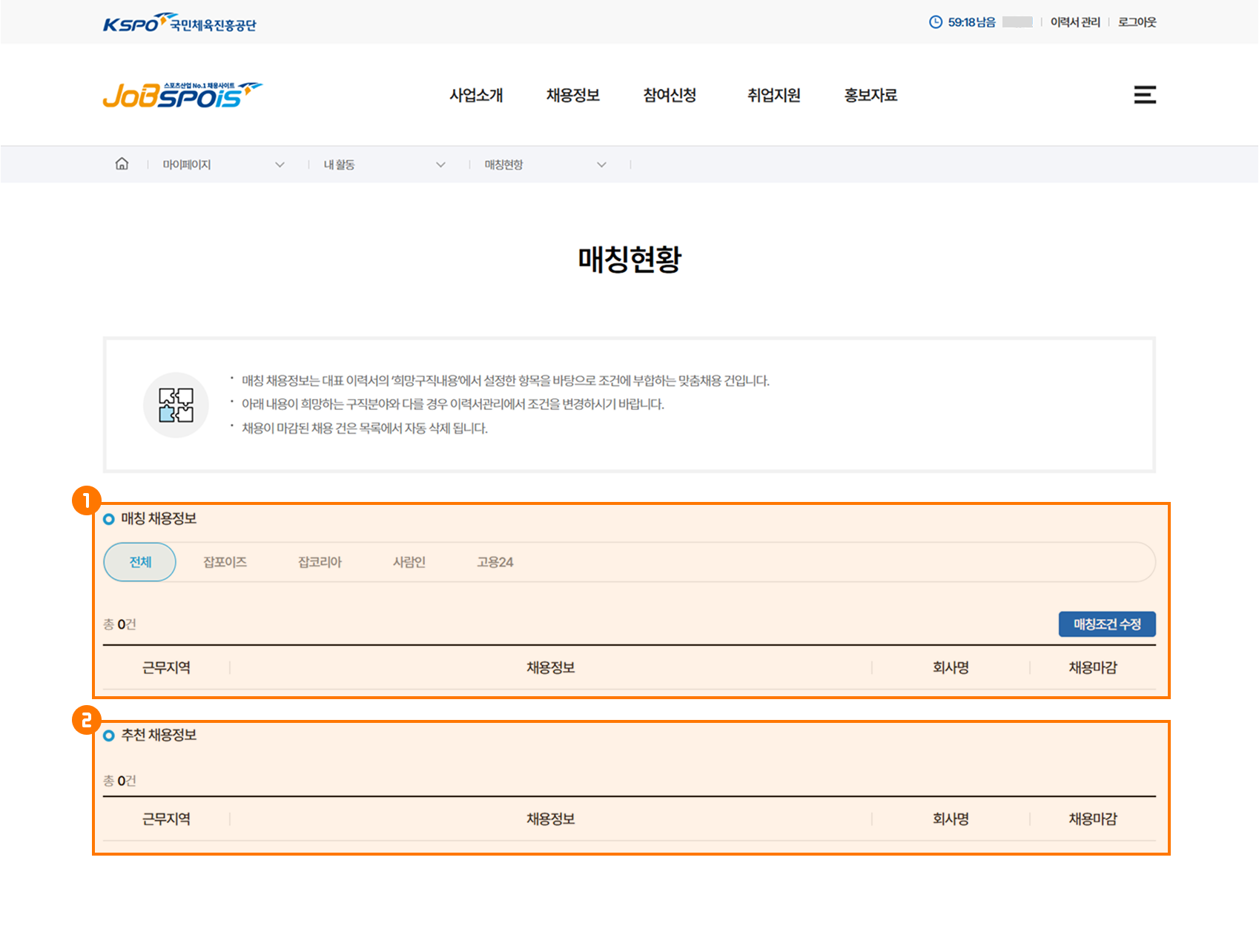 이력서 내 [부가정보]의 [채용매칭 필수항목]의 정보를 바탕으로 시스템이 자동으로 추천되는 매칭채용 목록입니다.