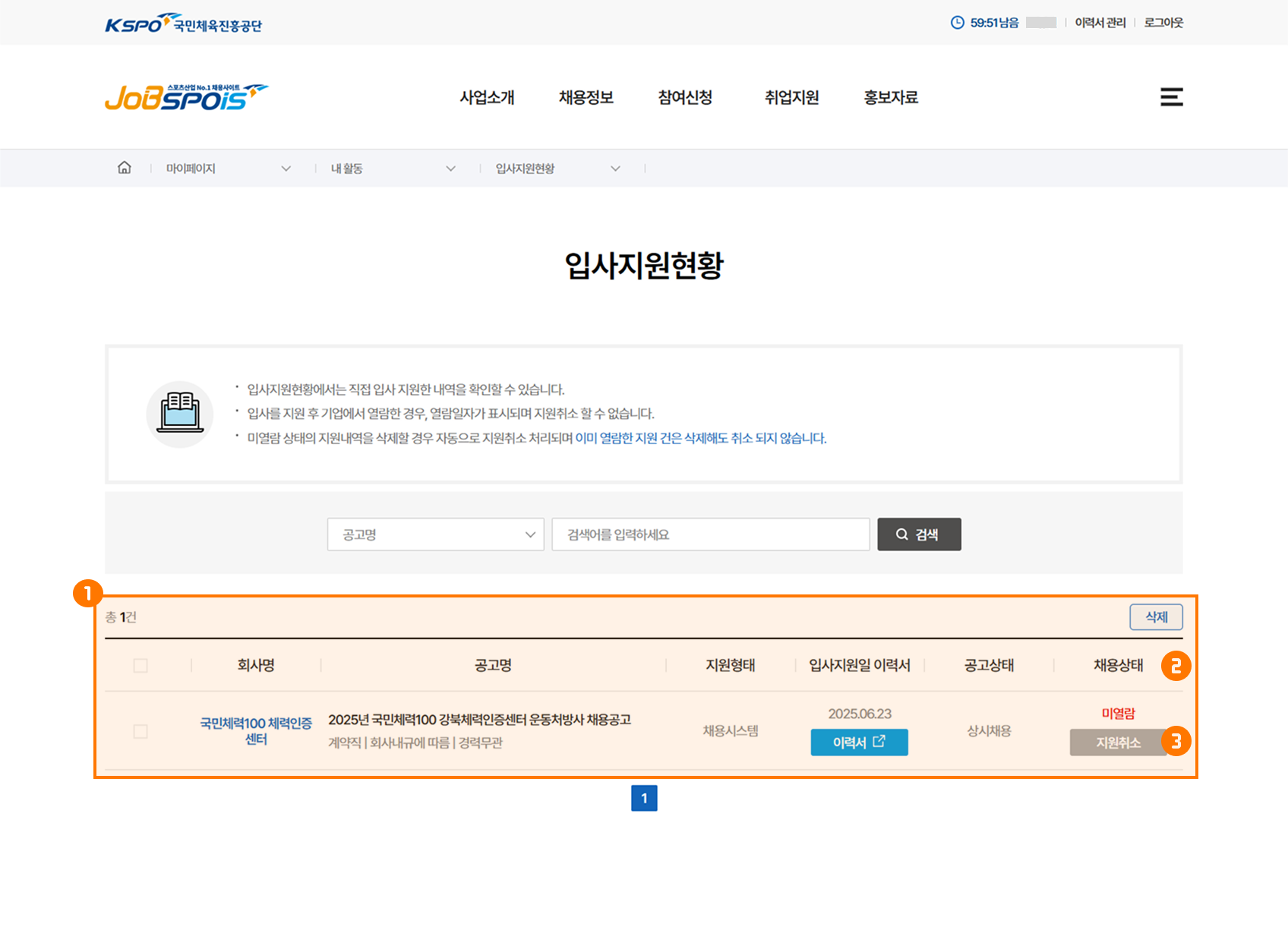 지원한 입사지원을 취소합니다. 미열람: [입사지원 취소]는 채용담당자가 확인하기 전 상태일 경우만 가능합니다.