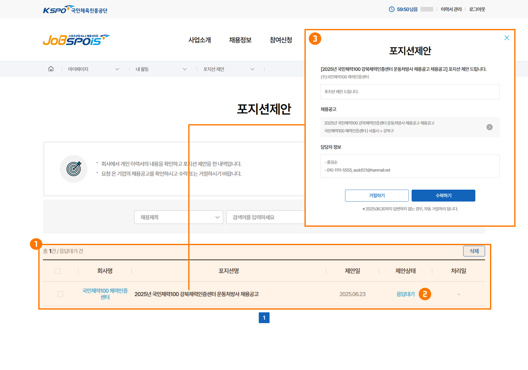 포지션 제안에 대해 수락 또는 거절 처리할 수 있습니다.(일주일 내에 응답하지 않는 경우, 자동 거절처리됩니다.)