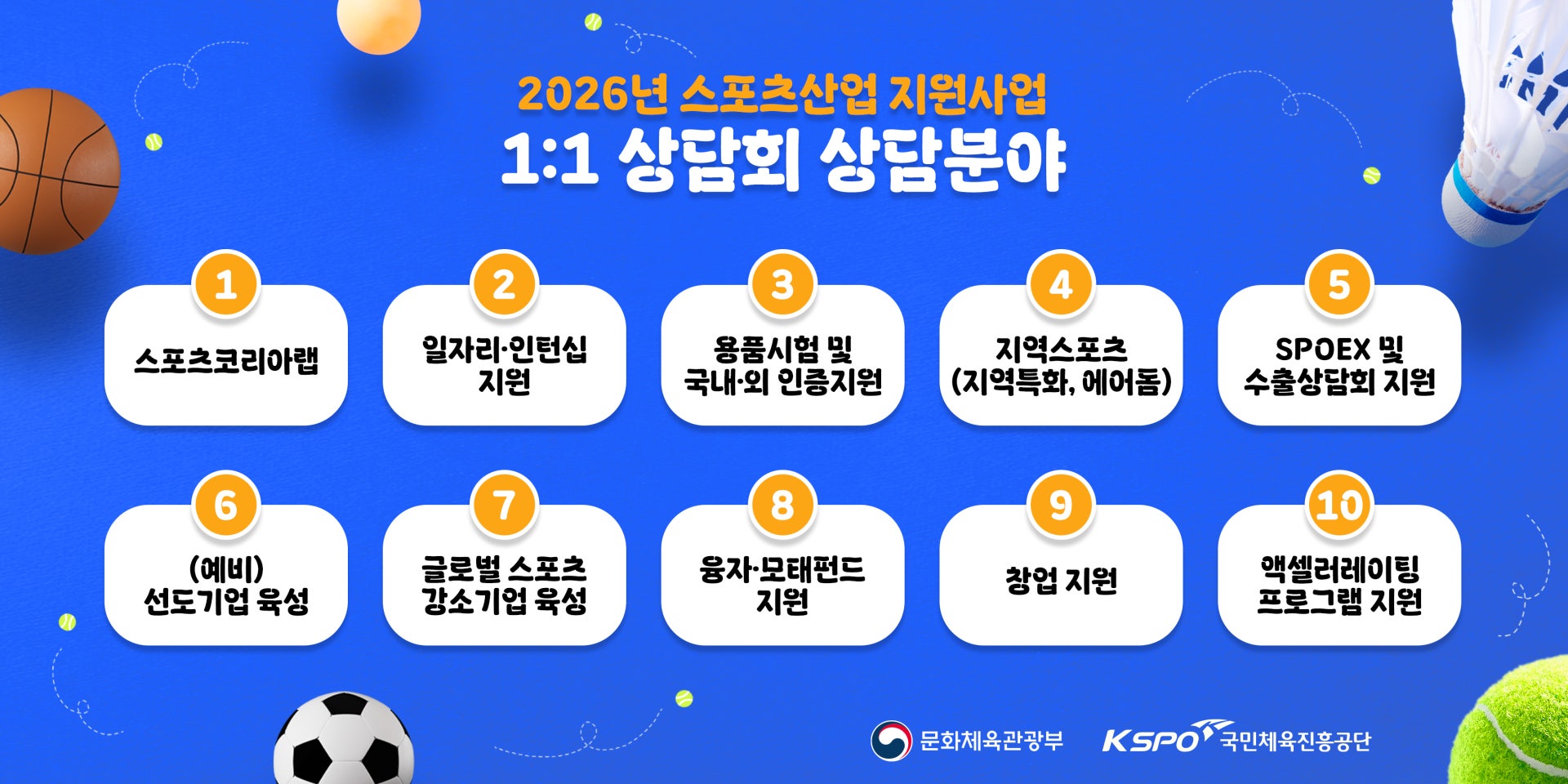안녕하세요. 산업진흥팀입니다. 2026년 스포츠산업 지원사업 설명회 참가신청 안내드립니다. 26년도 지원사업 설명회는 2025년 12월 11일(목) 15:30, 서울올림픽파크텔 1층 올림피아홀에서 개최됩니다. 이번 설명회는 '26년도 지원사업 예산규모와 사업별 지원내용 등을 안내드릴 예정입니다. 또한, 지원사업별 상담 부스(스포츠코리아랩 등 10개 분야)를 구성하여 사업 담당자와의 1:1 상담을 진행할 수 있습니다. 원활한 설명회 운영을 위해 설명회 참가자 사전 접수를 받습니다.